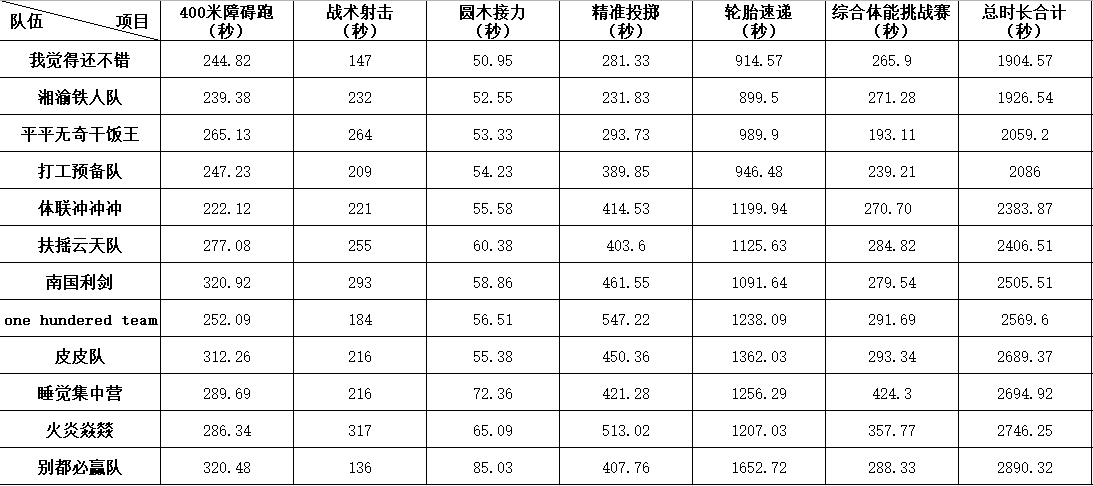 400米障碍赛、综合体能挑战赛是考验个人责任心的两个项目,这两个项目的比赛规则参照了“木桶理论”,即队伍时长是以参赛选手中“最差”选手的成绩计分,而非“最强”选手,这就要求队伍的每一个人都极具责任感、全情投入,才能让团队成绩出类拔萃。