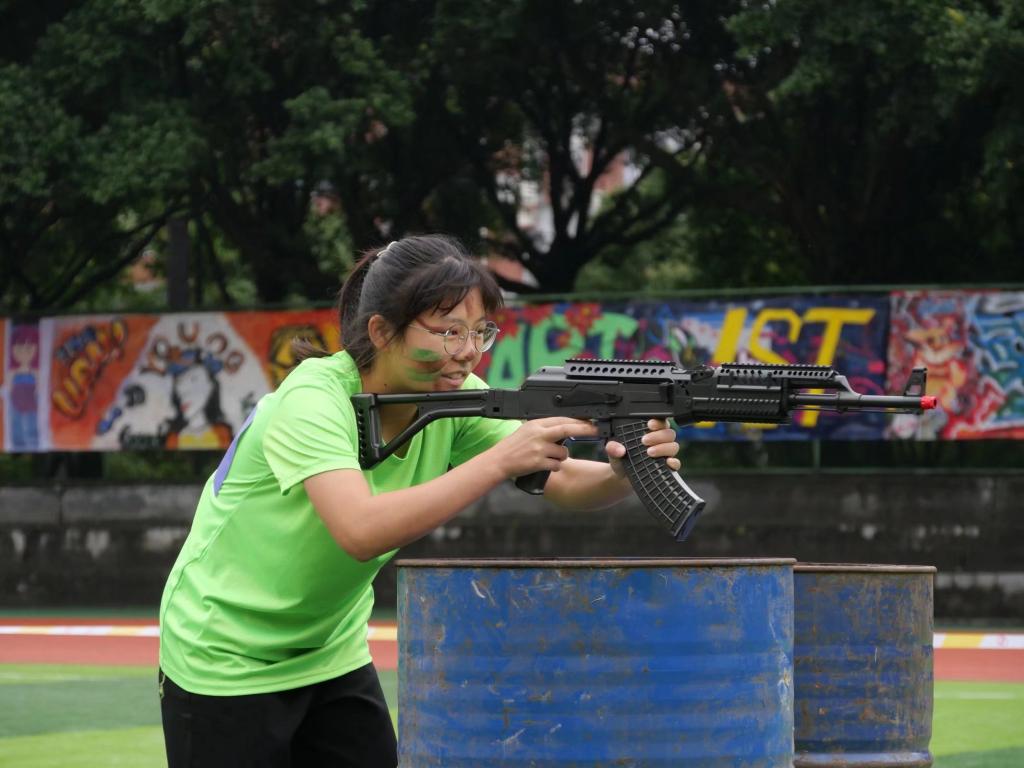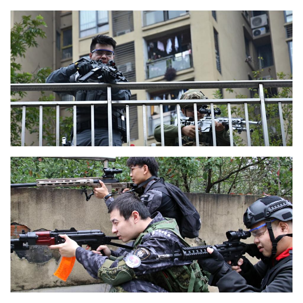 定点清除是本届军五的体验项目,以战术对抗射击为核心,参赛队伍既要寻找建筑物内的标靶,更要防范固定点的“突袭”。参赛队员则须要不止专注于眼睛到瞄准器再到标靶的三点一线,还得专注保持与伙伴的“三人背靠背”推进队形,方可既“克敌”又“制胜”。
