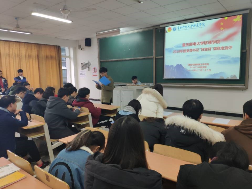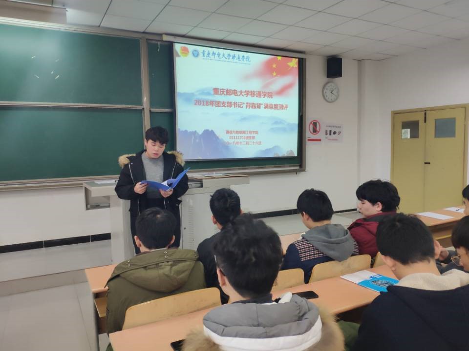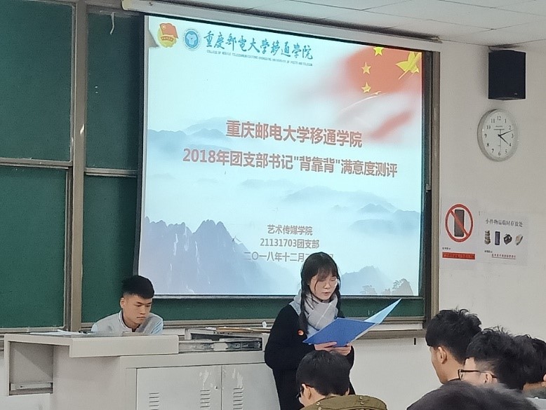 为落实全面从严治党、全面从严治团要求,响应团市委号召,进一步加强团支部书记队伍建设,通过“工作好不好,群众说了算”的评价机制,重庆邮电大学移通学院2018年度团支部书记“背靠背”满意度测评工作于2018年12月26日16:00在5201教室顺利举行。其中出席本次测评活动的有艺术传媒学院团总支书记李克伟老师、团委指导老师付梦竹老师、团委学生书记王韬可。