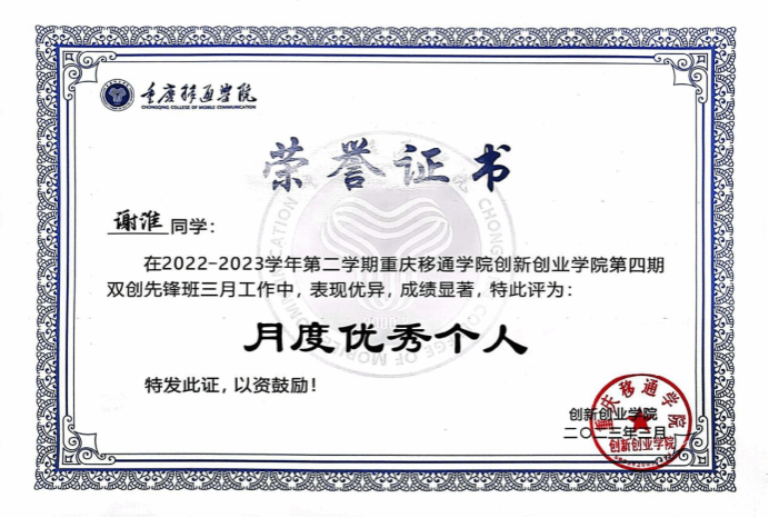 双创着力于以课堂教学、项目孵化、模拟实训、双创实践、社会实践的五位一体体系来打造学生们的组织能力和领导能力。谢淮把握此次机会,组建了新悦文化有限公司,以大赛VCR制作为经营范围。对于他来说创新创业就是要先创新市场产品,再专注的去实施项目进行创业。谢淮常说:“有困难不可怕,可怕的是不敢面对困难。”所以他对自己的要求严苛,目标坚定。哪怕成功路上布满荆棘,也不忘坚持前行。现在的他,在双创先锋班中熠熠生辉。