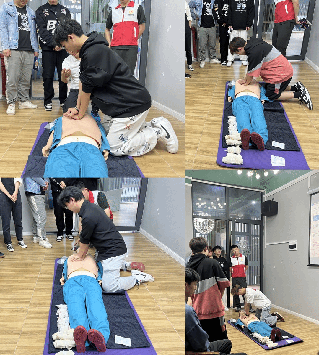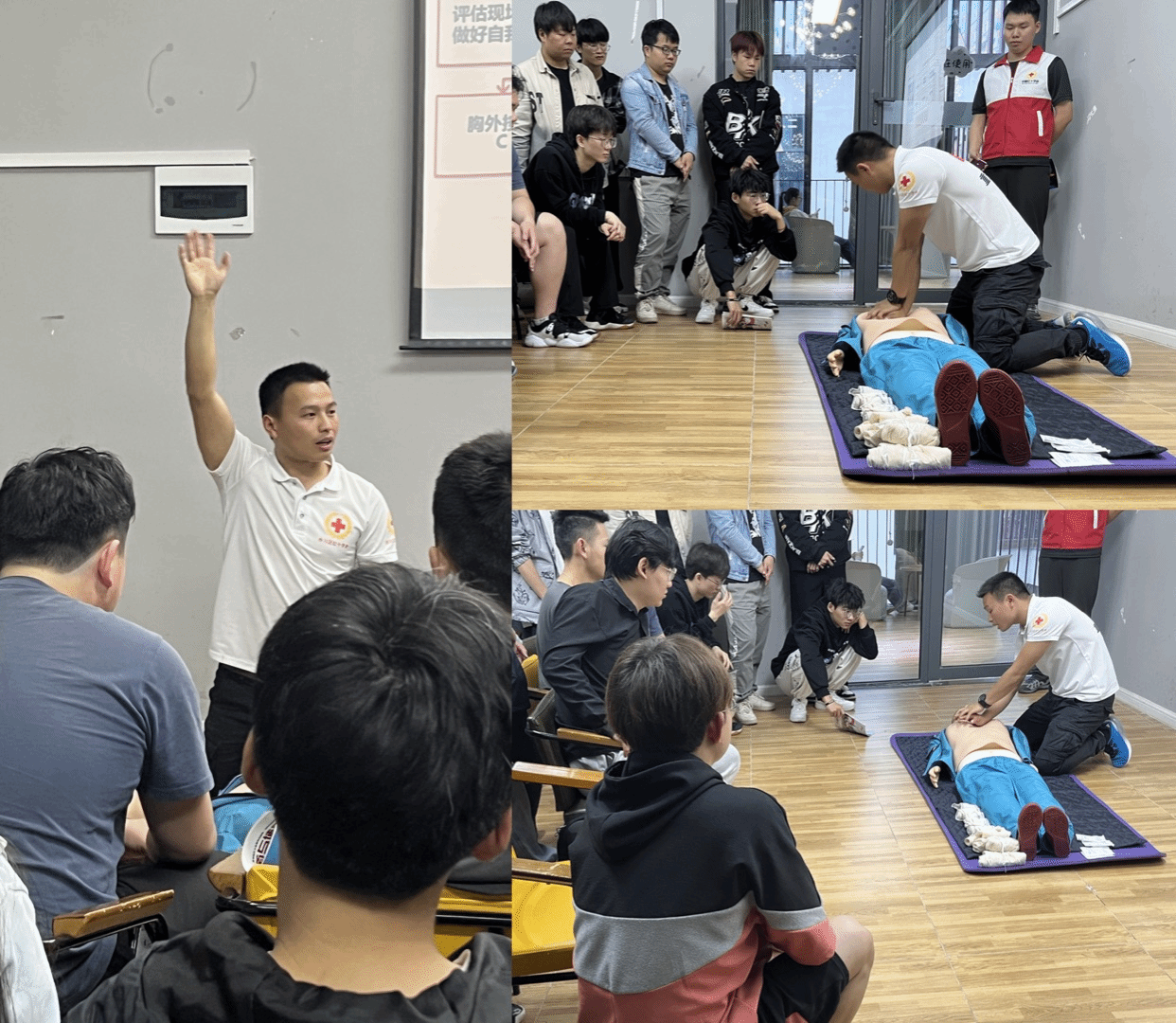 田教练采用理论知识讲解和实际操作相结合的方式,宣讲红十字运动精神和普及应急救护知识,系统的讲解了心肺复苏、海姆立克急救法和创伤包扎这三个部分的内容。