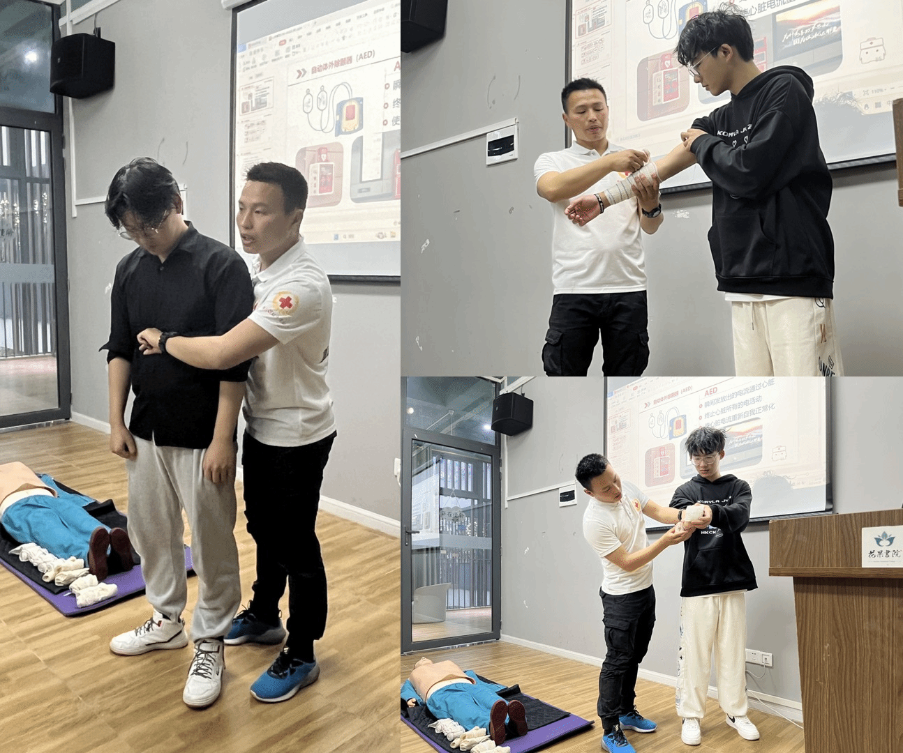 田教练生动的讲解以及专业的救护技术深深地吸引了在场的每一位同学。大家纷纷主动上台亲自操作急救技能,田教练也耐心地一对一进行指导,提示要点,纠正错误动作,力求每一个动作标准、到位。同学们也在最短的时间内掌握了如何自救互救,抓住“救命黄金时刻”,更好的保护生命的技能。