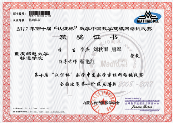 我校参赛人员在社联的指导和数学建模协会的组织下参加了数学建模网络挑战赛,协会选出六支队伍参加第一阶段,其中一支队伍获得二等奖,一支队伍荣获三等奖,四支队伍获得优秀奖。