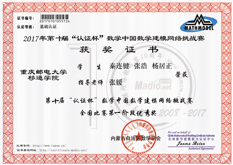 中国数学建模网络挑战赛,自2008年至今已举办了八届,它是由内蒙古自治区数学学会主办,由数学中国和第五维信息技术有限公司协办,由全球数学建模能力认证中心赞助支持的全国性数学建模活动。今年数学中国继续获得全球数学建模能力认证中心的授权,为参赛获奖的学生颁发数学建模能力认证,其目的是激励学生培养数学建模的能力,明确数学建模能力要求及范围,为数模社会效益化积累人才。