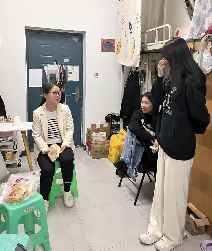宋娜娜老师走进学生宿舍C5,实地了解2022级工程管理专升本5班、6班学生的学习生活情况,送去关怀和问候,学生宿舍是大学生思想政治教育的一线阵地。全生异科导师走访学生宿舍,在交流中达到了教育目的,增进了师生情感,有利于营造文明、和谐、平安的校园氛围,为后续各项工作有序、平稳开展奠定了良好基础。