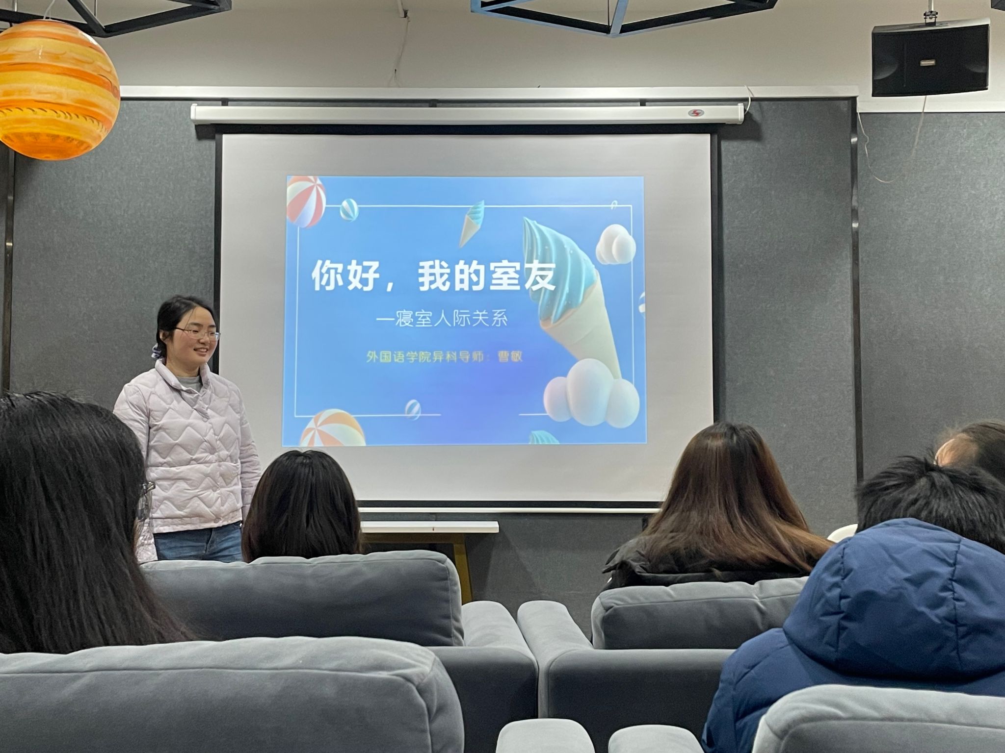 曹敏老师在汇江书院影音活动室开展了《你好,我的室友—寝室人际关系》的交流会。此次活动旨在帮助同学们能够正确掌握寝室人际关系的处理方法,建立良好的寝室氛围。本次交流会分别从寝室人际关系的重要性,易发生的问题,以及对引起问题的主要因素和处理方法四个方面进行。在交流的过程中,师生积极互动,开展了深入交流,同学们表示通过本次活动,收获颇丰。