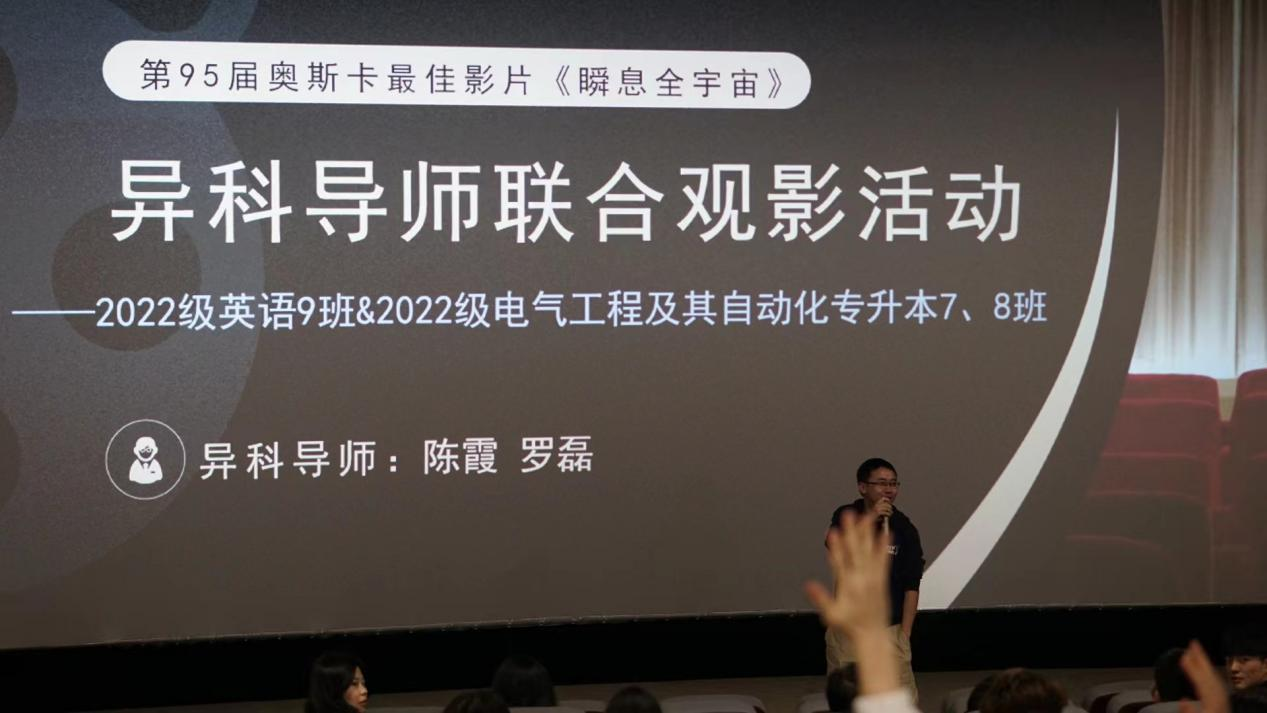 为丰富学生课余文化生活,提升学生的思辨力与表达力,同时促进学生间跨院系交流了解,异科导师陈霞、罗磊两位老师联动融合,带领各自异科班同学们相聚于六度空间·8½电影放映厅,共同观赏。之后,异科导师罗磊首先为同学们进行了影片简介,同时向同学们抛出了这样一个问题:为什么《瞬息全宇宙》在美国观众群体中好评如潮,然而许多国内观众却无法对影片产生深度共鸣?随着影片正式开始,同学们沉浸在光影世界之中,与杨紫琼所饰演的伊芙琳一起,体验了一段奇幻的生命旅程。