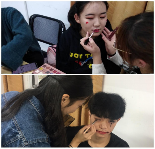 接下来就是让人期待已久的剧目表演+创意装扮环节了。学生们被分成不同的小组,进行体验式活动。在课前学生已做好了充分准备,构思出有创意的故事情节,做好装扮,撰写剧本,用英语进行角色扮演。其中,一个讲述中国僵尸与美国僵尸在街头相遇的情景剧,将中美的文化差异从语言表达、人物造型、肢体语言等方面表现的淋漓尽致,更是将整个表演环节推向了高潮。