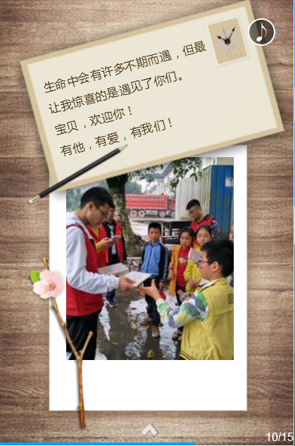 当皱纹爬满你的额,手无法抚平,让关爱顺着皱纹,流进眼眶;当童稚写满你的眼,手无法抹去,让关爱在前方,亮成明灯一盏;当寒风吹散你的发,手无法遮挡,让关爱环绕周围,温暖每个人的内心。公益走进校园,温暖相伴身边,关爱每一个孤单的人,温暖每一颗寒冷的心。