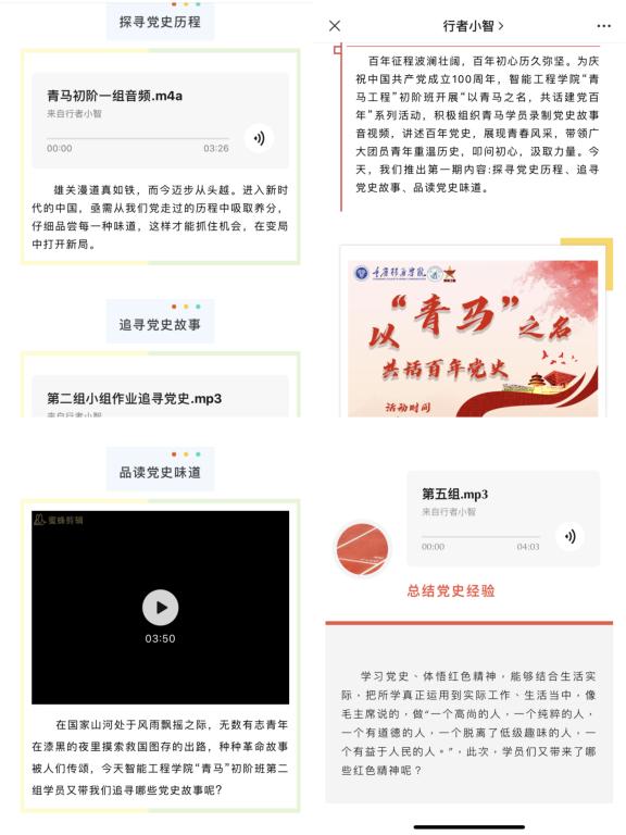 本次活动根据党史理论和“青马”学员实际分组情况,分别由:品读党史“味道”、追寻党史故事、探寻党史故事、领悟党史精神、总结党史经验以及汲取党史力量六大板块组成本次音频录制内容。