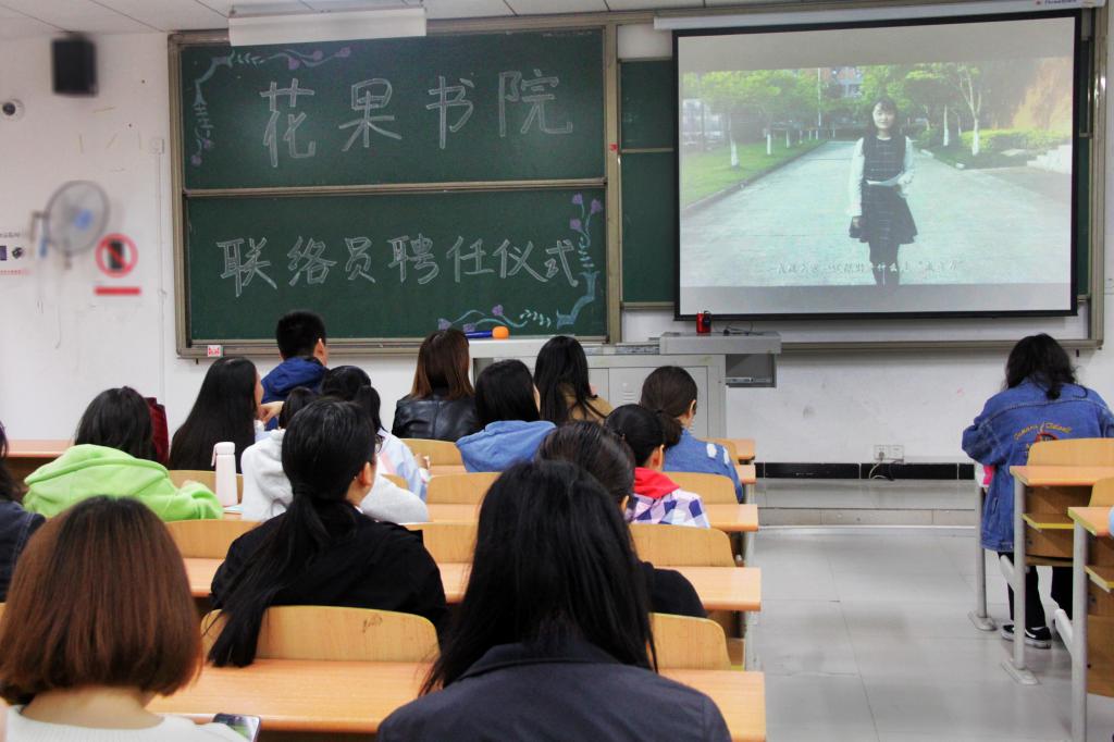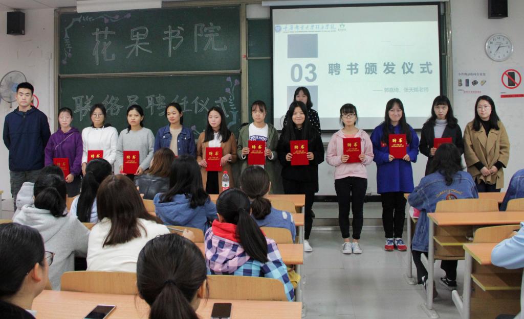 十年移通育桃李,标新立异建书院;花繁叶茂师生众,果树长青满校园;魅力花果树感召,明德笃学修己身;善济天下有责任,立己达人做榜样。为了能让同学们对书院的疑惑能够得到更加快捷的答复,让同学们更加了解书院以及更加积极地参加书院活动,花果书院于10月25日中午于第五教学楼5105举行了花果书院联络员聘任仪式。出席此次仪式的有花果书院综合办主任曹玉姣老师、学生发展导师郭嘉琦老师、张天赐老师以及花果书院各个寝室的联络员同学们。
