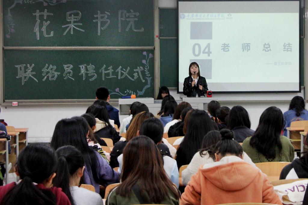 聘任仪式最后,曹玉姣老师对此次仪式做了总结,进一步讲解了花果书院和未来的书院硬件改造做了介绍,再一次强调了联络员的责任与义务。并希望以本次聘任仪式为起点,联络员们能以书院建设为己任,情系书院,心系花果,在未来的大学生活中,能给周边的同学起到榜样带头作用。此次活动也更加拉近了同学们和书院的距离,使花果书院的文化理念更加深入人心。书院联络员是同学们和书院之间联系和交流的重要枢纽,在这里不仅能让同学们更加了解书院文化、享受书院生活,更能培养同学们的责任感,让同学们成为一个更有责任心的移通学子。