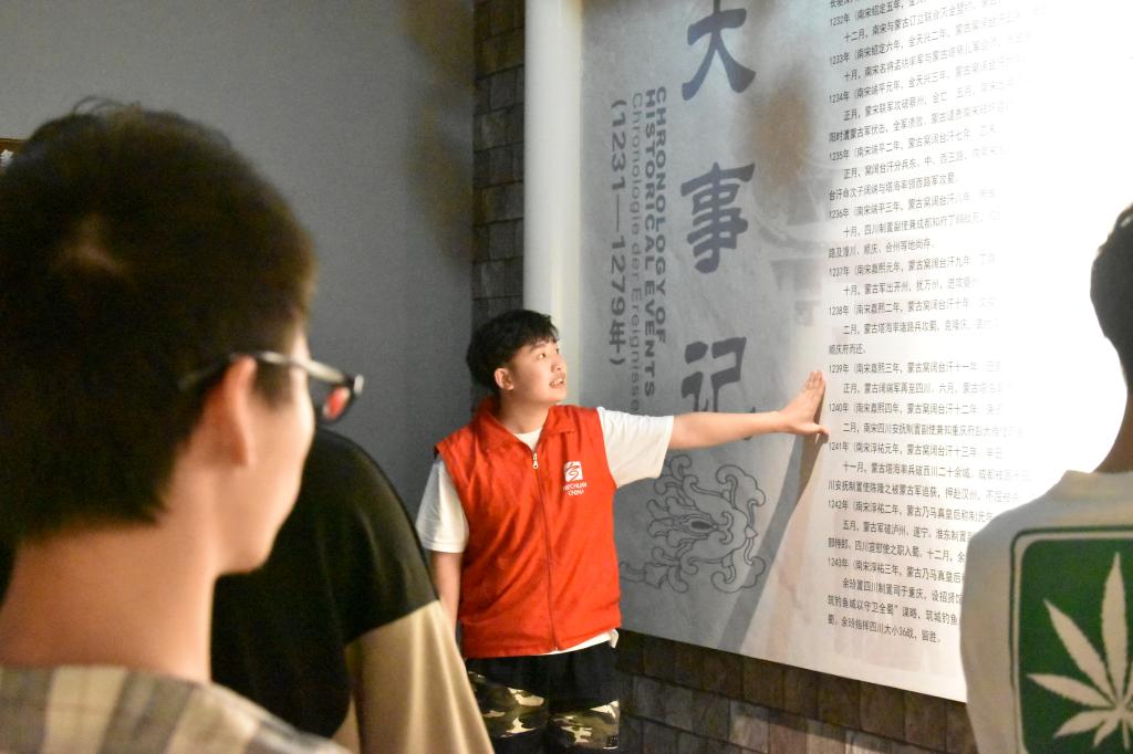 二楼展厅的“大事记”展区板块为同学们展现了钓鱼城战争中的重大事件,余玠、王坚等人的英勇事迹再次被提及,引起了同学们浓厚的兴趣,一边听讲解员的讲说,一边俯身阅览展墙的文字。钓鱼城军民的顽强不屈的抗争精神令人心生敬畏,有的同学不禁感慨:“正是如此英雄,才造就了如此英雄之城!”