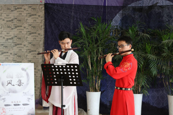 双葉动漫社带来了舞蹈《将进酒》,“黄河之水天上来,奔流到海不复回”如此气势磅礴的诗句,连带它的舞蹈也是极为有力度,一挽扇,一挥袖之间好不帅气,亦如同这首诗的主人一般的傲气。移通学院笛箫协会带来得吹奏表演《大鱼》,笛箫之声悠扬婉转。时而缠绵悱恻,时而高亢激昂。在场观众认真欣赏着如此清越的曲子。