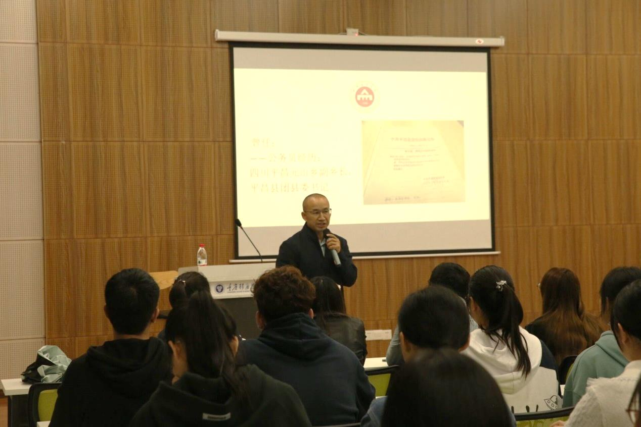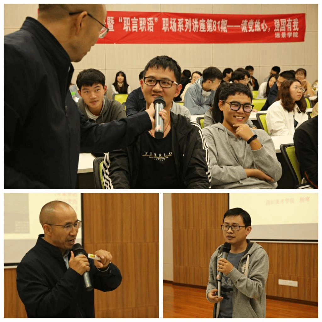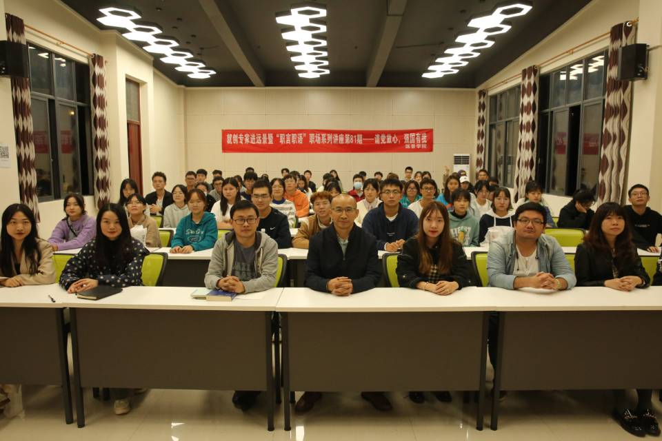 为进一步促进远景学子主动探索大学生涯,从大学开始就重视自我的发展,明确自己的大学目标,2021年10月14日19:00,四川美术学院党政办副主任、教育部2021—2025年全国普通高校毕业生就业创业指导委员会委员、教育部全国万名优秀创新创业导师人才库专家、成渝地区双城经济圈高校就业创业“双百”导师团专家、重庆市高校创业指导教师专家库专家杨寒老师,莅临我校天渠书院报告厅,举行了第81期“职言职语”系列讲座——“请党放心,强国有我”。