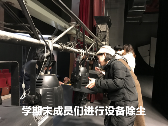 “一个人可以走得很快,一群人却走得更远”。剧场学生管理团队的小伙伴们趁复习温故之余,抽空对缤果大剧院、下里巴人剧场的设施设备进行了放假前最后一次整理。技术服务组逐一对19根舞台机械吊杆和120多个音响灯光设备进行除尘;礼仪服务组对场内座椅使用情况进行了最后校对;办公事务组对场内所有物资进行了清点;新闻宣传组整理学期各项活动影响资料,即使最后的总结检查工作繁杂枯燥,但各组仍然将每一项工作认真做好,履行职责。完满长路,在剧场的每一刻,每一帧,都是美好的记忆。心往一处想,劲往一处使,也许这就是团队荣获学校第六季“完满·力量”的捷径。