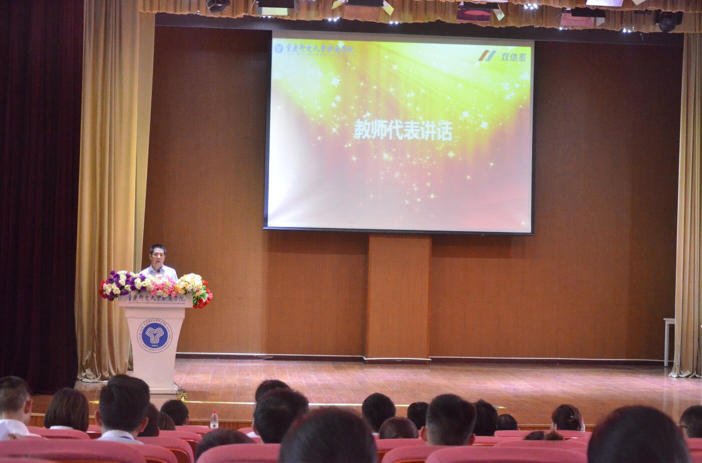 14时30分,在老师和同学们的掌声之中,开学典礼正式开始。由重庆邮电大学移通学院院长助理周伟老师宣读公文,在录取公文宣读的过程中,同学们神情肃然,背也悄然的挺直,为正式获得双体学子这份殊荣感到骄傲和神圣,随后周伟老师向同学们表达了学校对全体学员殷切的期许。