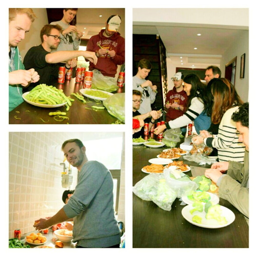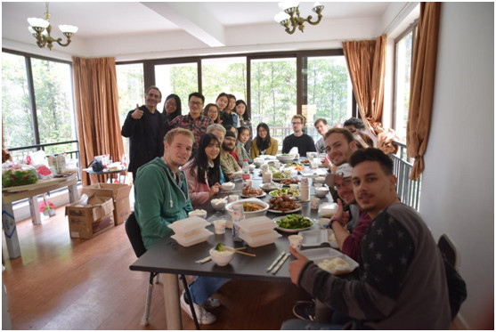 上午11时,所有人到达半山会所,在搁放好自己的物品后,大家纷纷卷起衣袖进行卫生清洁和午餐烹饪。从地板上匆忙的脚步声、厨房里叮叮咚咚的碗筷声就可以感受到大家对“小合作”抱有浓厚的兴趣,留学生Marcel在卫生清洁完后说道:“这样的一次小清洁既不累人,同时还可以跟着中国的小伙伴学习中文,真有意思。”厨师组则在自己的“阵地”中精心准备着午餐,当大家饥肠辘辘、恰巧又端上一盘盘“渝式大餐”时,大家情不自禁地赞扬:“厨师做的饭菜太好吃了,我们非常享受这种感觉。”