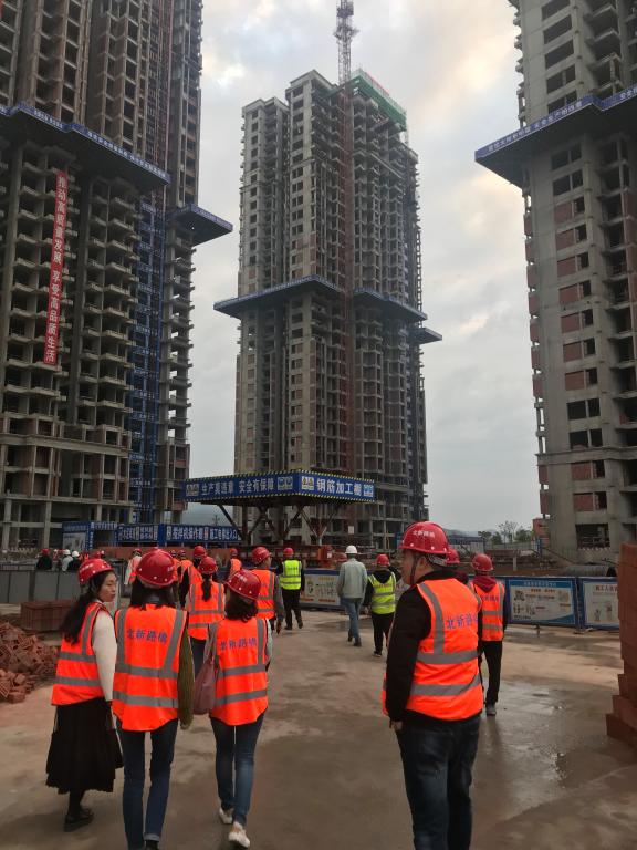对项目有了初步了解以后,由我校工程管理专业毕业的学长带领我们前往御龙湾建筑工地进行实地考察。在徒步前往的路上,学长感叹道:纸上学来终觉浅,绝知此事要躬行。学习完理论知识后,实践又是一场学习的开始。到达工地的指挥部后,施工单位首先给我们分发安全帽和工作服。老师们耐心指导学生正确穿戴安全帽并严格检查佩戴情况。在听取项目经理的施工进度报告和安全施工情况后,在项目经理等人的陪同下开始参观学习。本次考察内容为:车库顶板钢筋制安施工成型质量、6#楼砌筑施工成型质量、8#楼安全防护标准化施工、7#楼清水样板房。