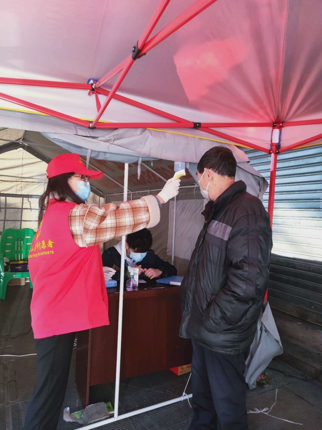 (为值守卡点居民进行体温检测与登记)