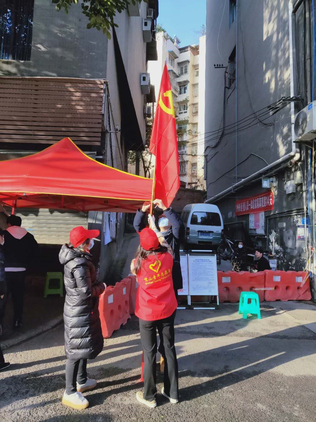 (作为青年代表,为值守防疫卡点插上党旗)