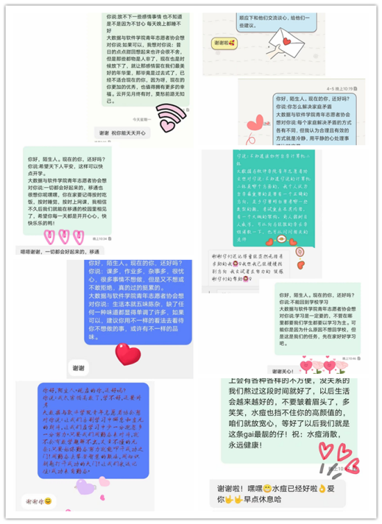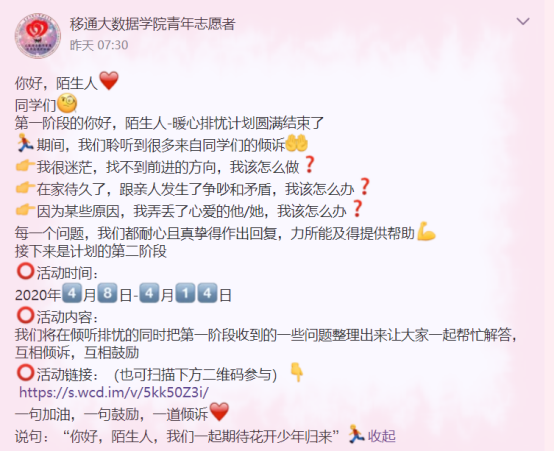 因疫情原因,同学们宅在家中的时间日益增长,部分同学产生了烦躁、迷茫等负面情绪,为此校团委携手大数据与软件学院于4月1面向全校师生启动“你好,陌生人——暖心排忧计划”,通过该暖心计划给予同学们更多的关注,成为他们的倾听者,帮助他们排解心中烦恼,疏解心中苦闷。让同学们学会正确释放负面情绪,以最好的状态迎接疫情之后的未来。