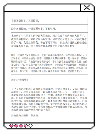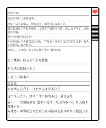 在活动初期,许多同学都积极地参加到此次活动中,也许是久久不能出门而感到心情压抑,又或是学习中遇到迷茫,不知所措,又或是其他种种原因,在得知这样一个活动的第一时间,同学们纷纷将自己的心事一股脑儿的倾泻出来。