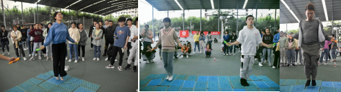面对一块块蓝色指压板,平时经常锻炼的小干事们早已跃跃欲试,可缺乏锻炼者此刻心生恐惧,可是为了部门的荣誉,不得不硬着头皮、咬紧牙关,一口气坚持跳完。这场比赛结束后,副团长刘德静对大家说:“今天看到同学们参加比赛时的各种表现,让我看到志愿团勇于奉献的集体意识始终在传承。每一位干事都有着强烈的集体荣誉感,愿意为部门、为社团牺牲小我。然而,这不是我们活动的初衷,我们更希望每一位团员都有着健康的体魄,首先独善其身,才能兼济天下。我们应该是强者的帮助,而不弱者的牺牲。”