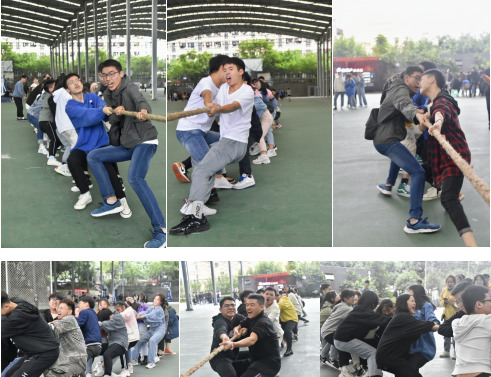 只听一声副主席刘洋一声令下,拔河的双方前腿崩直、后腿弓步一个个攒足力气向后拉。排在绳索末端的同学虽然瘦小,但也尽量将身体重心向后倒,企图用押上仅有的体重来换取团队的胜利。