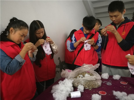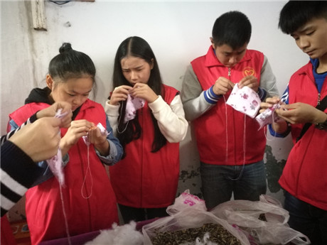 在幸福气息充斥的院子里,老人们笑脸开怀的和我们聊天。我看着这一张张满被岁月碎片划伤留下伤痕的脸,顿时有些感伤。老人很热情的和我聊着天,虽然因为地理原因,没办法顺畅地交流,但我可以看到他们眼神里的热情,感受到他们那颗长久寂寥的心温暖的兴奋。我们给老人们制作香包,这么让我得到了缝纫的技能,一包包色彩鲜艳香包寄予着我们的陪伴。如果说今日的雨些许沉闷,那么移通学院的志愿者们便是温柔的一道凉风;如果说今日的合川无阳,那么移通学院的志愿者们便是一道暖阳;如果说孤独的是老人,那么移通学院的志愿者们便是给予他们陪伴天使。