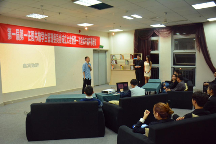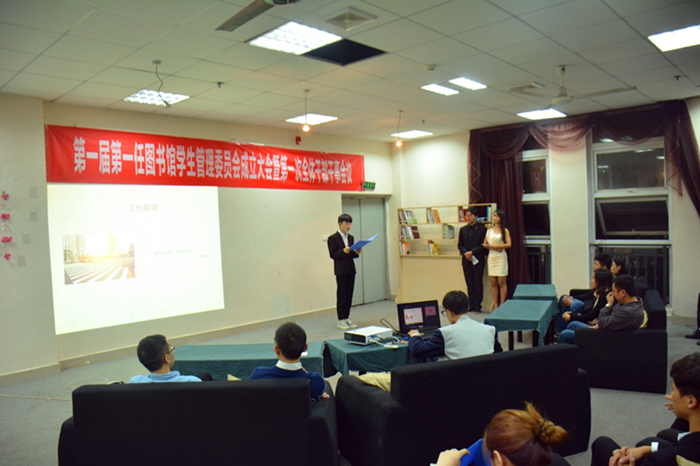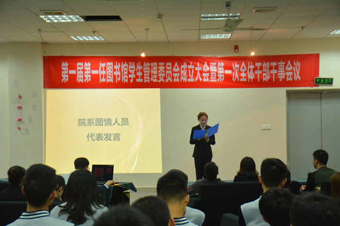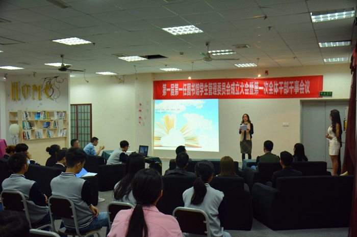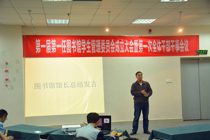 飘着细雨,吹着凉风,夜晚的校园也似乎有了秋的寒意,但有那么一群人迎着秋分,赏着细雨,欢聚于图书馆,掌声与欢呼淹没了寒意。10月27日晚9点,图书馆第一届第一任学生管理委员会成立大会暨第一次全体干部干事会议在图书馆十二楼图书馆文化活动室隆重举行。图书馆秦代辉馆长、通识教学部罗磊老师、图书馆吕淑艳老师、黄启容老师、张正光老师、李臣老师以及图馆会全体成员参加了本次会议。