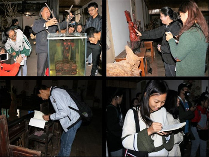 活动间隙,学生研究员们与彭勇老师进行了交流互动,彭勇老师向大家讲到根雕的制作步骤,即寻料、去皮、阴干、审材、立意、固形、粗打磨、创作定形、精打磨、命名、配座、抛光、上蜡等步骤,以及濒临失传的“蚂蚁上树法”、“断头延伸法”、“自然回归法”、“移花接木法”等制作技艺。谈及根雕,彭勇老师认为最重要的是寻根,不忘本,不断寻找新材料,用新的材料来更新自己,对待根雕也是这种态度,既要立足传统,又要传承、创新。彭勇老师现在最担心的便是这门艺术会失传,他准备用拍摄视频的方式记录制作根雕的过程,让根雕这门艺术能够更好地被传承。