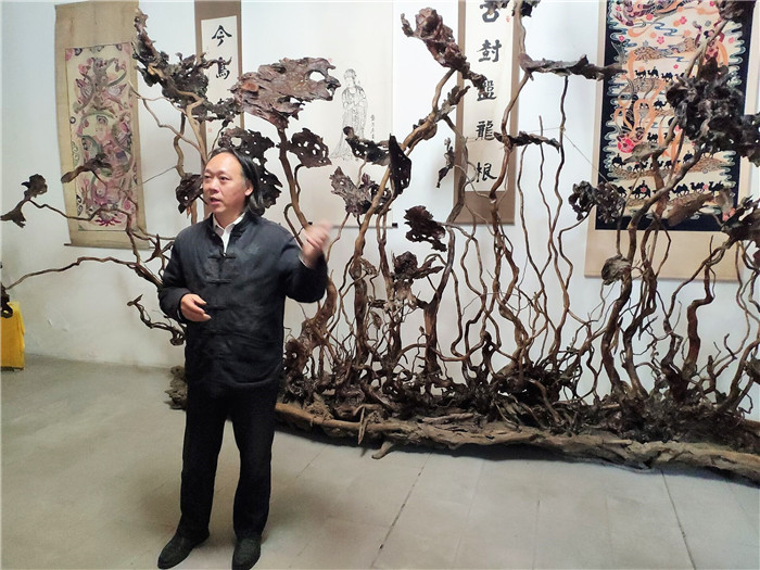 大家一边参观,一边聆听彭勇老师介绍,创作一件如《百鸟朝凤》这样大型的根雕需要几年甚至十几年的时间,且是纯手工制作,如此耗费人力、时间的活动也从侧面反应了根雕的艰难。而每一件根雕作品不仅仅只是一份技艺,其背后有着不同的故事、神话,表达出不同种类的深刻含义,发人深省。