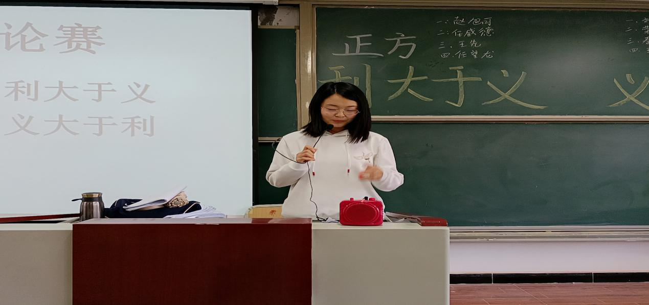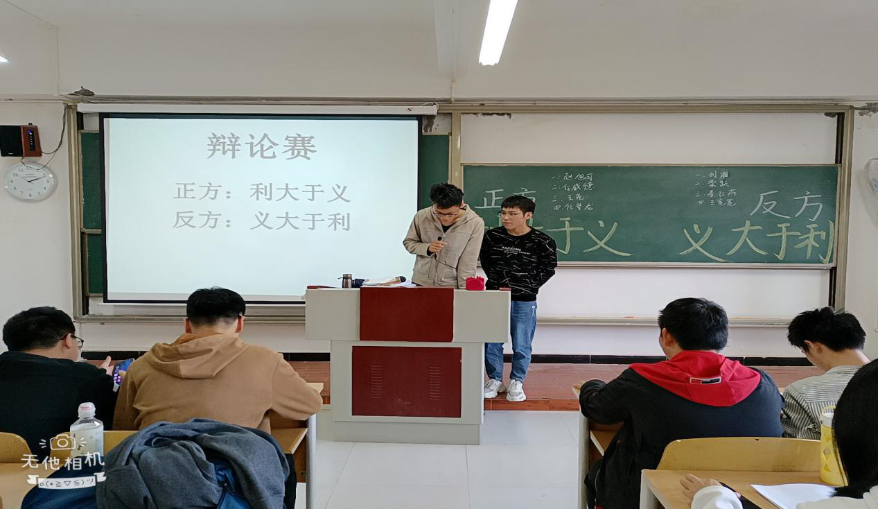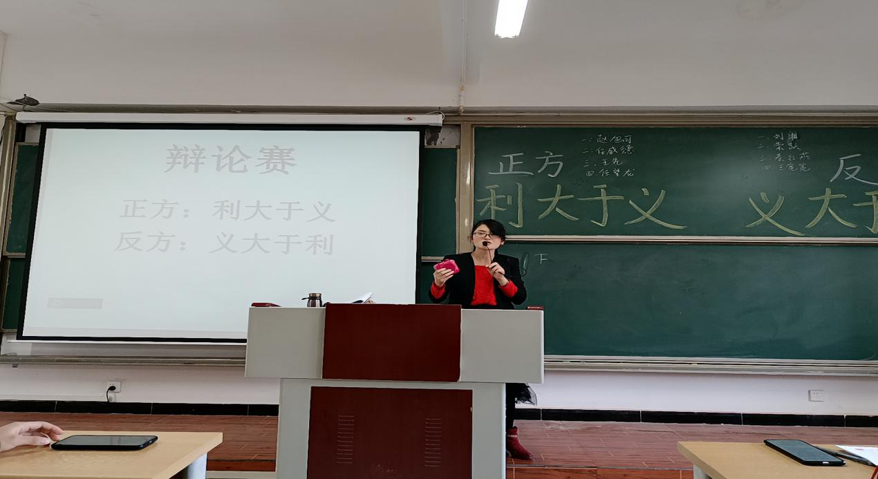 为推进“以学为中心”的教育教学改革,按照“阅读+讨论+实践+写作+陈述”的教学设计闭环,推进通识教学部课程质量优化,培养学生的“批判性思维能力”、“沟通与表达能力”,通识教学部的张爱春老师在教授《苏格拉底、孔子所开创的世界》课程中,创新教学模式,突出学生的主体地位,用辩论赛方式开展课堂教学。2020级机械设计制造及其自动化1、2班开展了关于“利大于义·义大于利”的辩论赛。本次辩论赛的主持人为陈扬,计时员为赵先胜,裁判为严俊辉、朱灵和李茜。持“利大于义”的正方辩手为赵旭可、任威德、王先、任望龙。持“义大于利”的反方辩手为刘湘、荣跃、秦红燕、王宽宽。机械设计制造及其自动化1、2班的其余同学作为观众积极参与自由辩论环节。