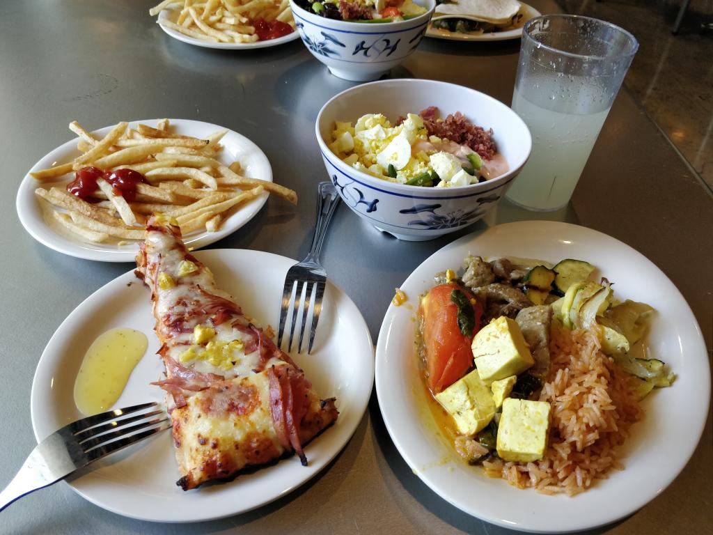 每日穿梭在校园来来往往的学子中,感受来自世界名校的学习氛围,不免自己也紧张忙碌起来,特别是在Session E的课程开始后,每日的作业量也是猛增。就如网上文艺小青年说的一样“世间唯有美食不可辜负”,每一结束当天的课程,都想着去食堂大吃一顿好好犒劳自己疲倦的灵魂。我们每天吃的食堂是学校最大的一个,crossroad canteen,离我们宿舍也不远,出门一百米就到了。整个食堂以自助餐的形式对食物进行的供应,分主食,沙拉,三明治,披萨,油炸,饮料,甜品,水果等几个区。毫不夸张的说美洲真是热量大国,披萨上的芝士似不要钱似的往上加,油炸区轮流提供着炸鸡,炸薯条,炸热狗等高热量食物。主食区每顿都是两素一荤的搭配。当一天的课程结束后,走进食堂,在碗里放好几样自己喜欢的素食,挤上千岛酱,将另一个碗往上面一扣,双手将两个碗的碗底固定住,这时候你就可以上下摇晃将碗里的素食和千岛酱均匀混合在一起。蔬菜原本的清脆和清香可以驱散油炸食物带给你的油腻的感觉。主食区的东西每天都给你惊喜,有时候是墨西哥风味,有时候是中餐,有时候是西餐,感觉在一个食堂就吃遍了全世界。