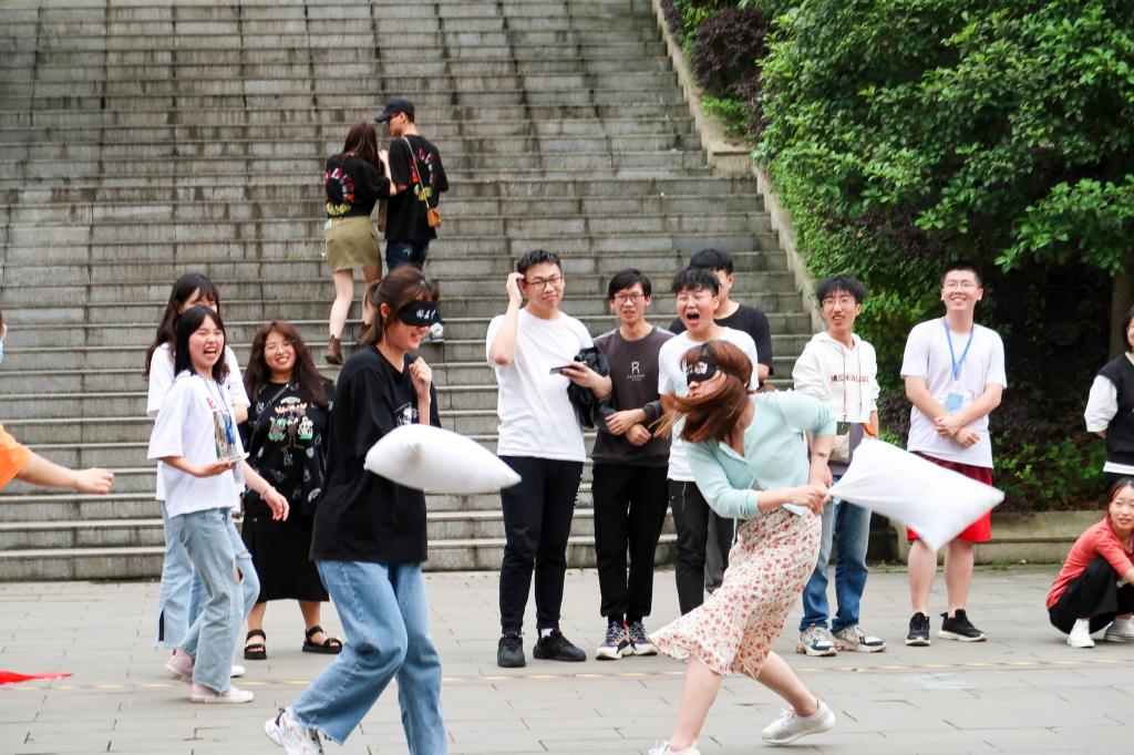 在平时快节奏的学习生活中积攒了了不少压力,那就通过运动来释放吧。同学们纷纷蒙上眼睛,在黑暗的环境中随心而动,挥打手中的枕头来获得胜利的信号。其中涌现一位连胜七位同学的女强者,让现场的同学们纷纷叫好,同学们在释放压力的同时,渐渐拉近彼此的距离,增强凝聚力。