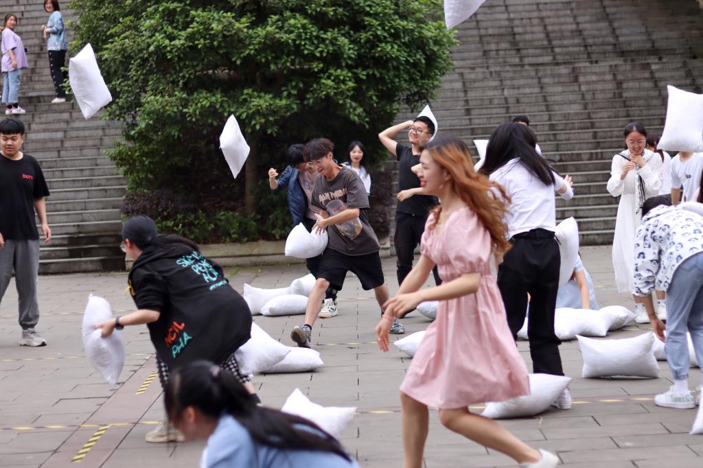 压轴的枕头大战把整个活动推向了高潮,同学们将枕头想象成自己无法释放的烦恼,在音乐响起时将烦恼一一抛向天空,只留下快乐和喜悦。大战一触即发,枕头漫天飞舞,你来我往之际的小广场瞬间沸腾起来,大家在大汗淋漓中收获放松和欢笑。