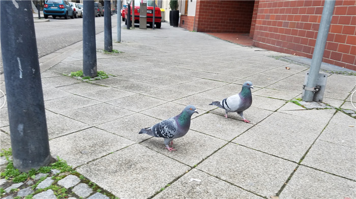 (曼海姆街道两只正在悠闲散步、觅食的漂亮鸽子)