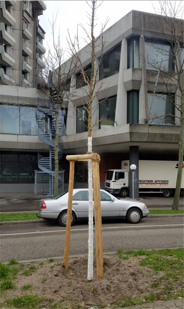 除去人们的环保行为,德国的市政部门在园林绿化对树木的保护方面也下足了功夫。曼海姆街道两旁的有新栽种的小行道树苗,为了让这些个小树苗好好生长,他们专门为每一株小树苗配上三根呈三角形60度角的木桩,把小树苗牢牢地固定在地上,确保其生长。