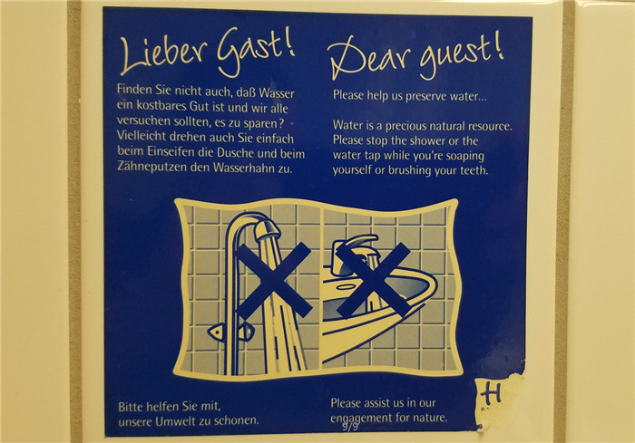一到洗手间,不经意间一抬头,发现墙上贴有一张小小的温馨提示标语,分别用德语和英语两种语言书写道:亲爱的客人,请帮助我们节约用水!水是宝贵的自然资源,当你在用肥皂擦洗身体或者漱口的时候,请关掉淋浴或水龙头。在文字下方,还特意画了两张图配在上面,提醒客人。这种请求帮助的温馨提示,这样柔和的语气,客人看过,怕是再不好意思浪费了吧。