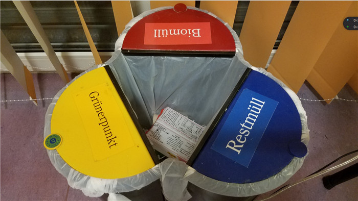 刚到海德堡SRH大学,一住进学校提供的公寓,就发现房间里的垃圾桶与国内不同,垃圾桶分成红、黄、蓝三色,分别存放三类不同的垃圾,分门别类,便于垃圾的回收和分类处理,有利于垃圾的有效处理和高效回收利用。