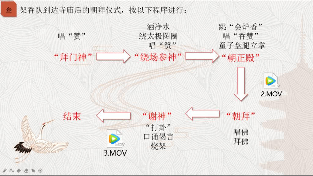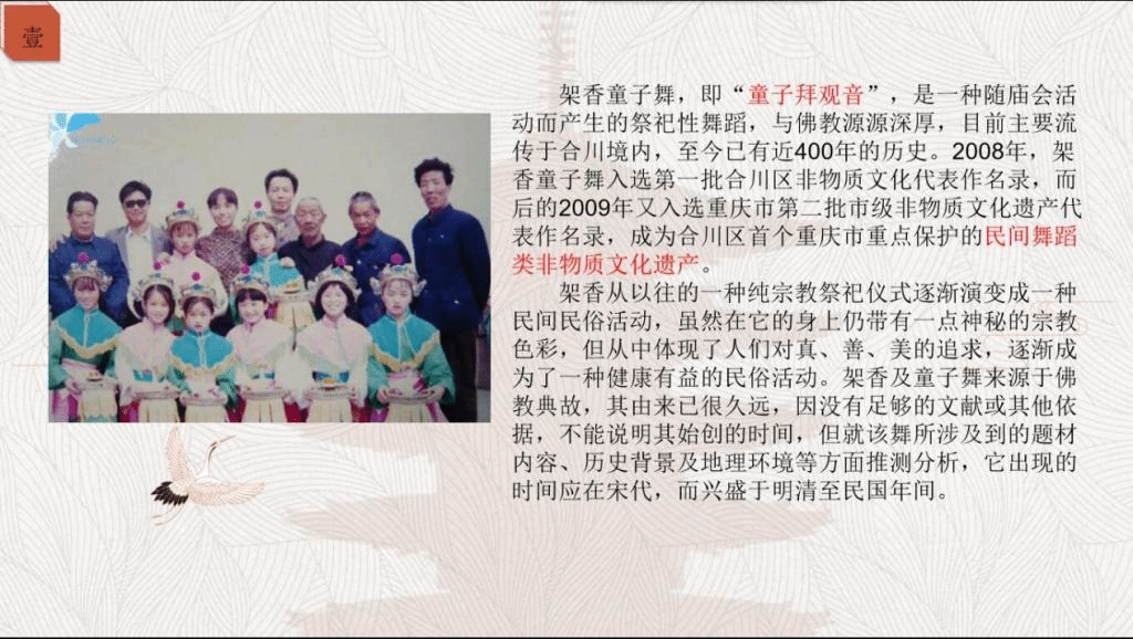 李菲同学整体介绍架香童子舞,它作为一种随庙会活动而产生的祭祀性舞蹈,与佛教渊源深厚,主要流传于合川境内,成为合川区首个重庆市重点保护的民间舞蹈类非物质文化遗产。通过李菲同学介绍艺人张四全的调查、架香童子舞从业者余兴福的口述以及播放架香童子舞的音乐视频,生动离奇的民间故事让成员们被具有独特魅力的“架香童子舞”所吸引。社员们了解到架香童子舞与人们对观音菩萨的敬拜密切关联,也是对孝道的弘扬。