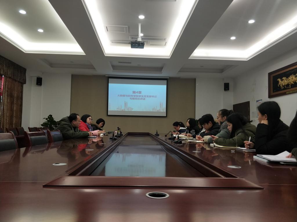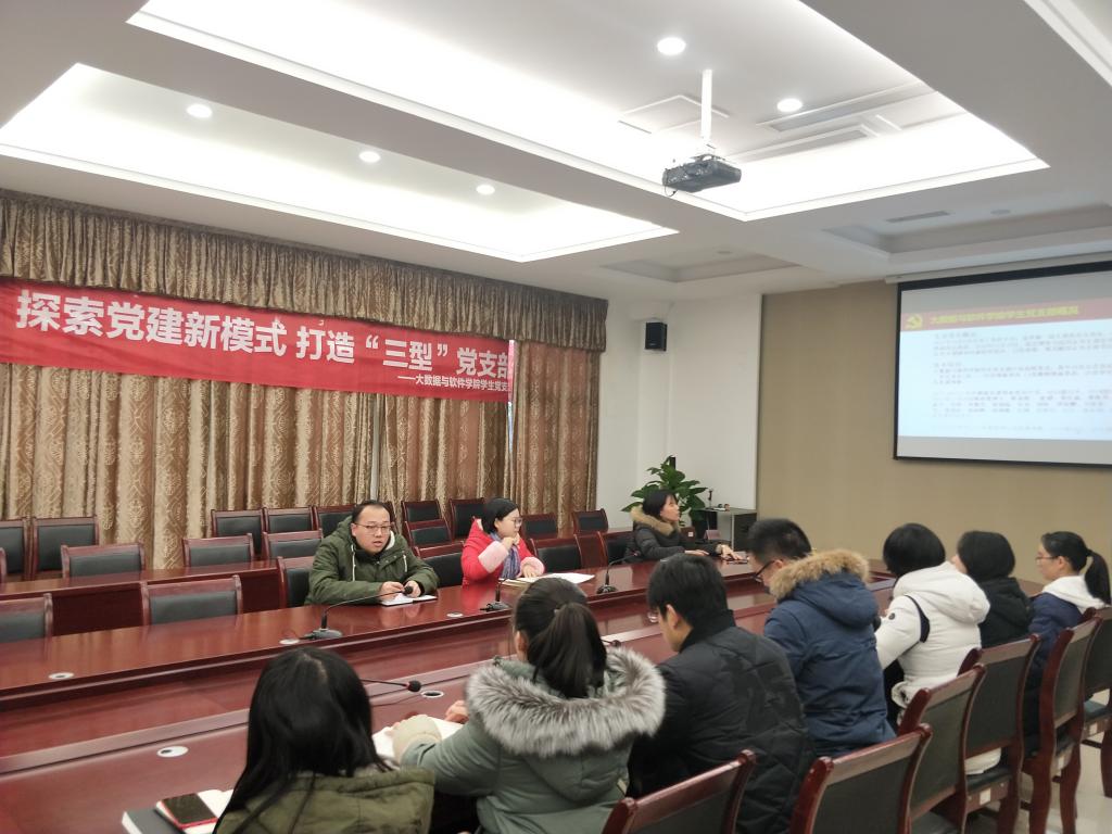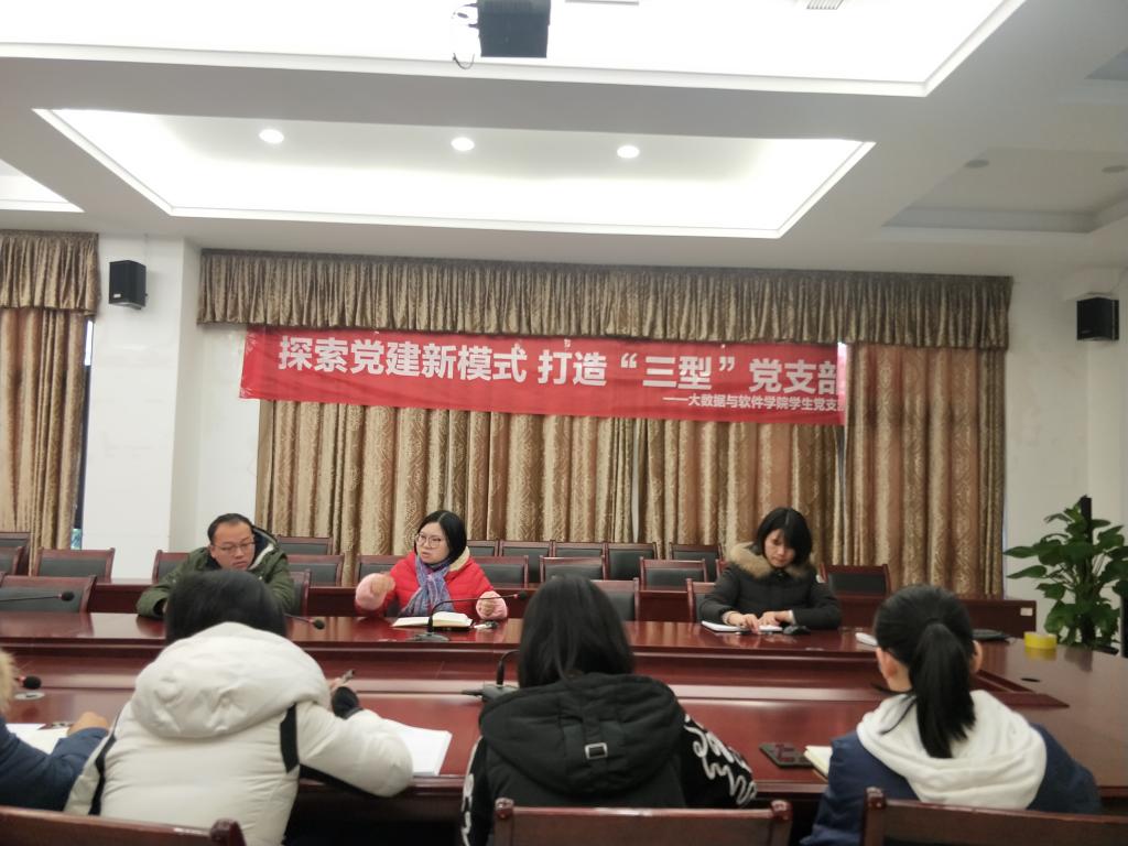 大数据与软件学院书记毛敏同志首先公布本支部委员增补以及调整的人员通知,2018年11月19日,提出增补马喆同志为支部宣传委员,调整任瑞娟同志为支部副书记兼组织委员,报校党委审批备案。任瑞娟同志对于调整一事表示,会以学习的态度,积极的心态继续有力开展支部工作。马喆同志,对于新加入支委表示,以后会以身作则,高标准要求自己,更好的做好服务与引领工作。支部委员新成员的加入,意味着新力量的凝聚,同时支部内部加入了很多新入职的学工教师党员,为此任瑞娟同志为大家继续介绍了支部的基本情况:大数据与软件学院40名在校党员,其中10名正式党员(包含教师党员9人,学生党员1名),30名预备党员(3名教师预备党员,27名学生预备党员),同时吸纳32名发展对象。