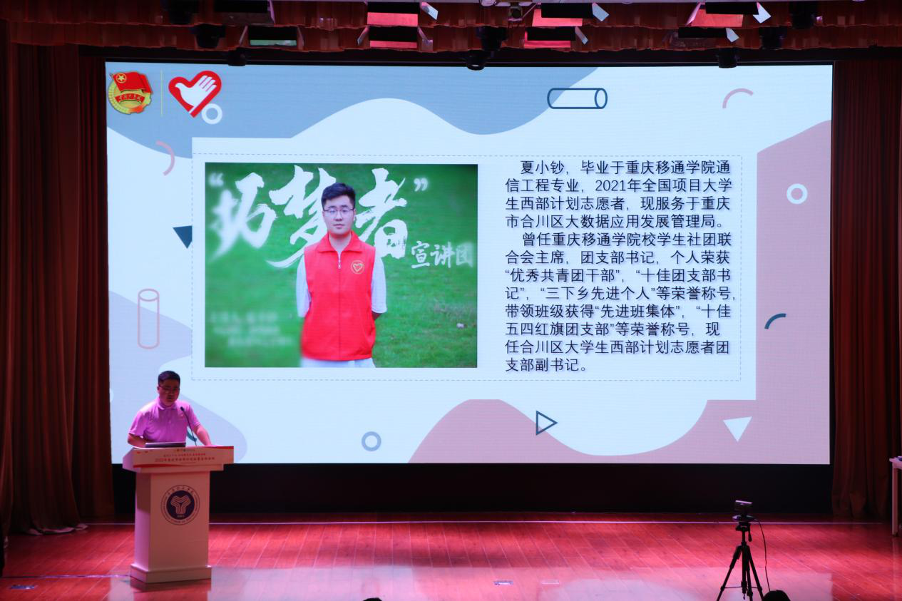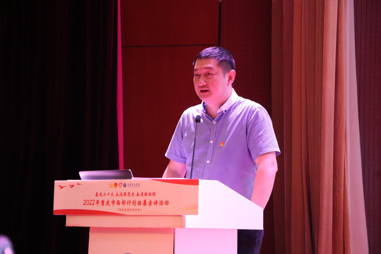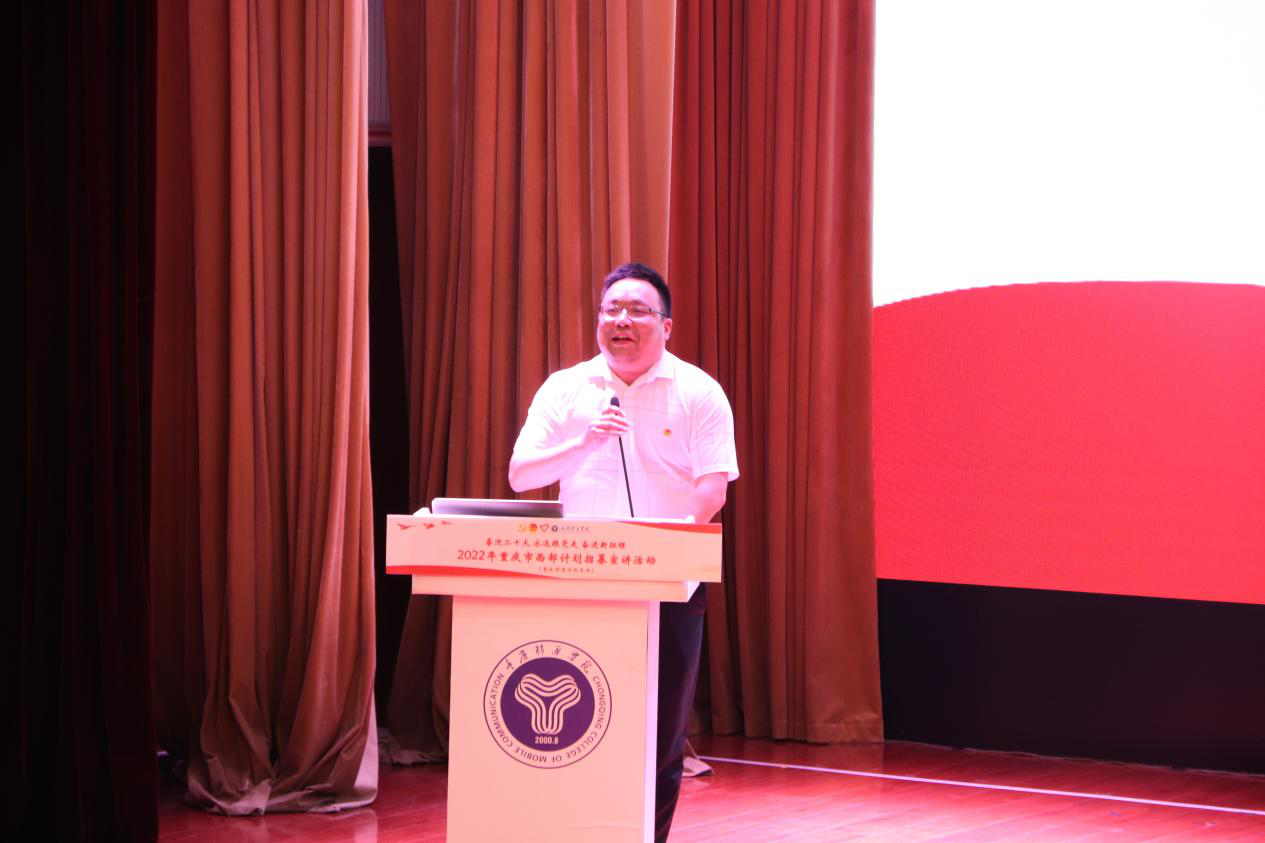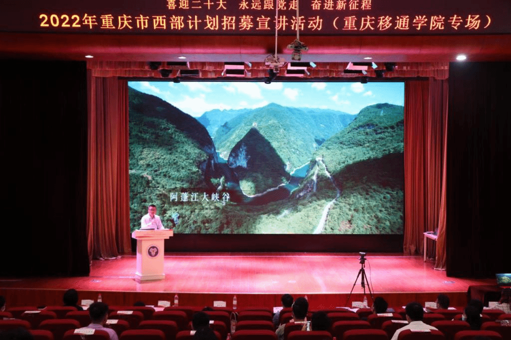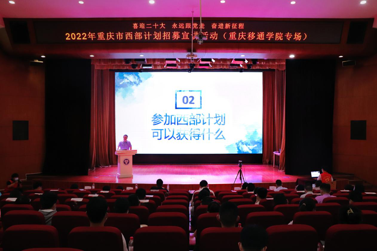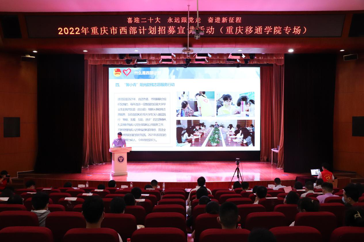5月7日重庆市西部计划项目办走进移通学院,由校团委牵头,于下里巴人剧场开展了“喜迎二十大、永远跟党走、奋进新征程”2022年重庆市西部计划招募宣讲活动。市志愿服务工作指导中心主任龙江、校团委副书记谢银平、蔡星宇,渝北区、巴南区、合川区等12个区县团委负责人、服务县西部计划项目办工作人员、市西部计划优秀志愿者代表,以及我校师生代表共计600余人通过线上线下参与其中。