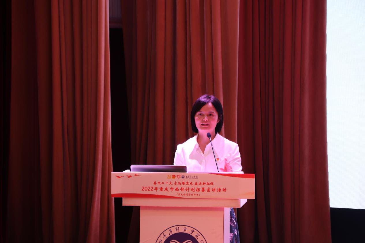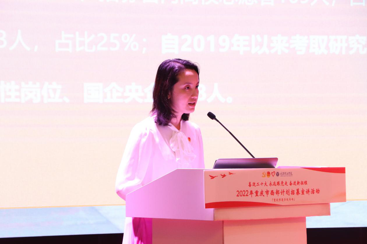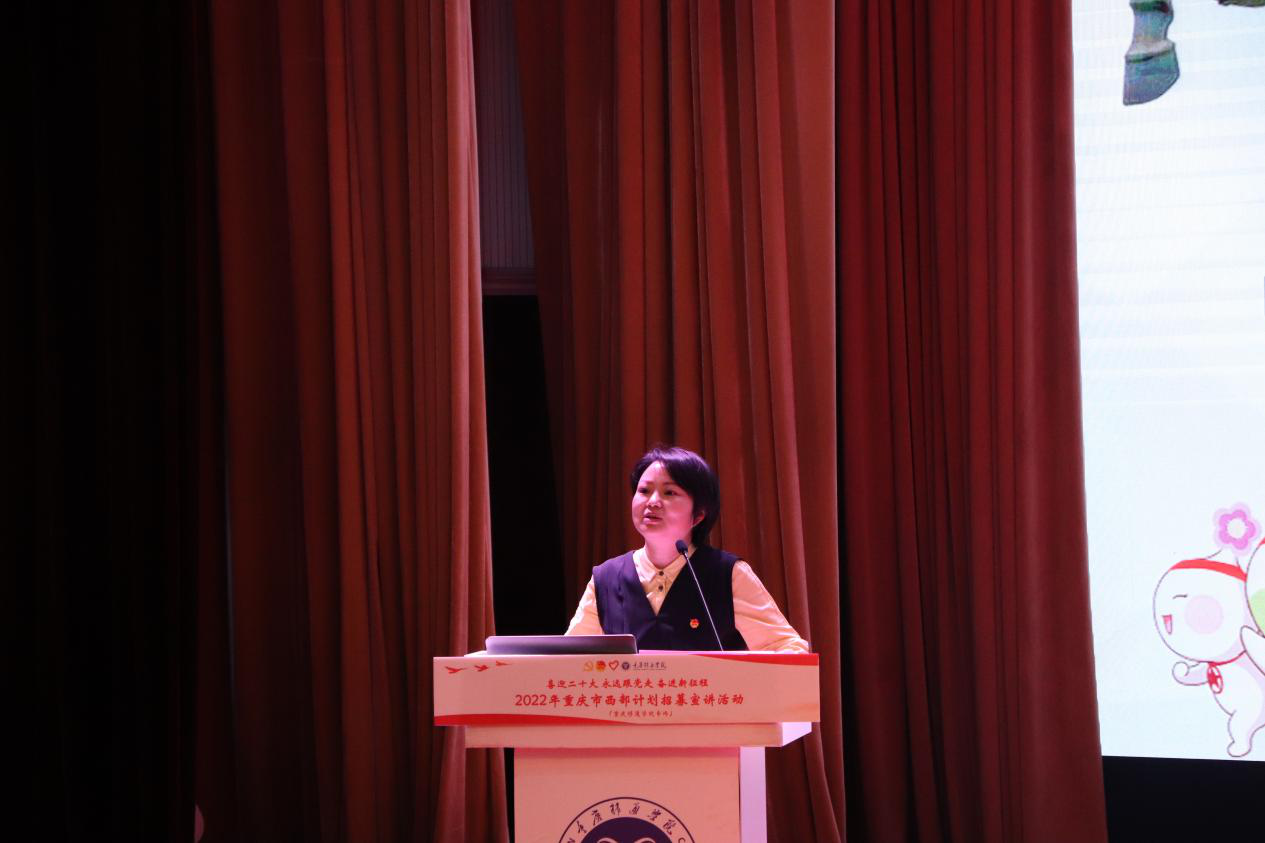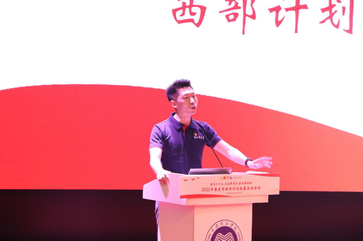 据悉,此次“2022年重庆市西部计划招募宣讲活动”在重庆仅开展三场,其中一场在我校开展。这场活动的落地,是对我校西部计划工作的有力肯定。自我校西部计划工作实施以来,一直积极响应团中央号召,在学校党委和上级团组织的领导下,大力弘扬志愿精神、培养学生家国情怀,引导学生把个人理想追求融入国家和民族的事业之中,不断推动全校大学生志愿服务西部计划工作蓬勃发展。近三年来,累计选派300余名应届毕业生奔赴祖国西部书写最美的志愿青春,实现自我价值。