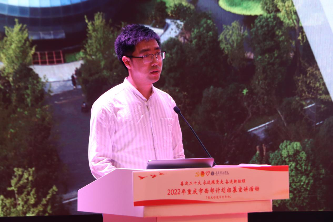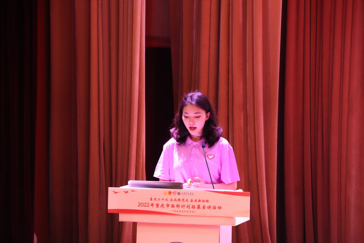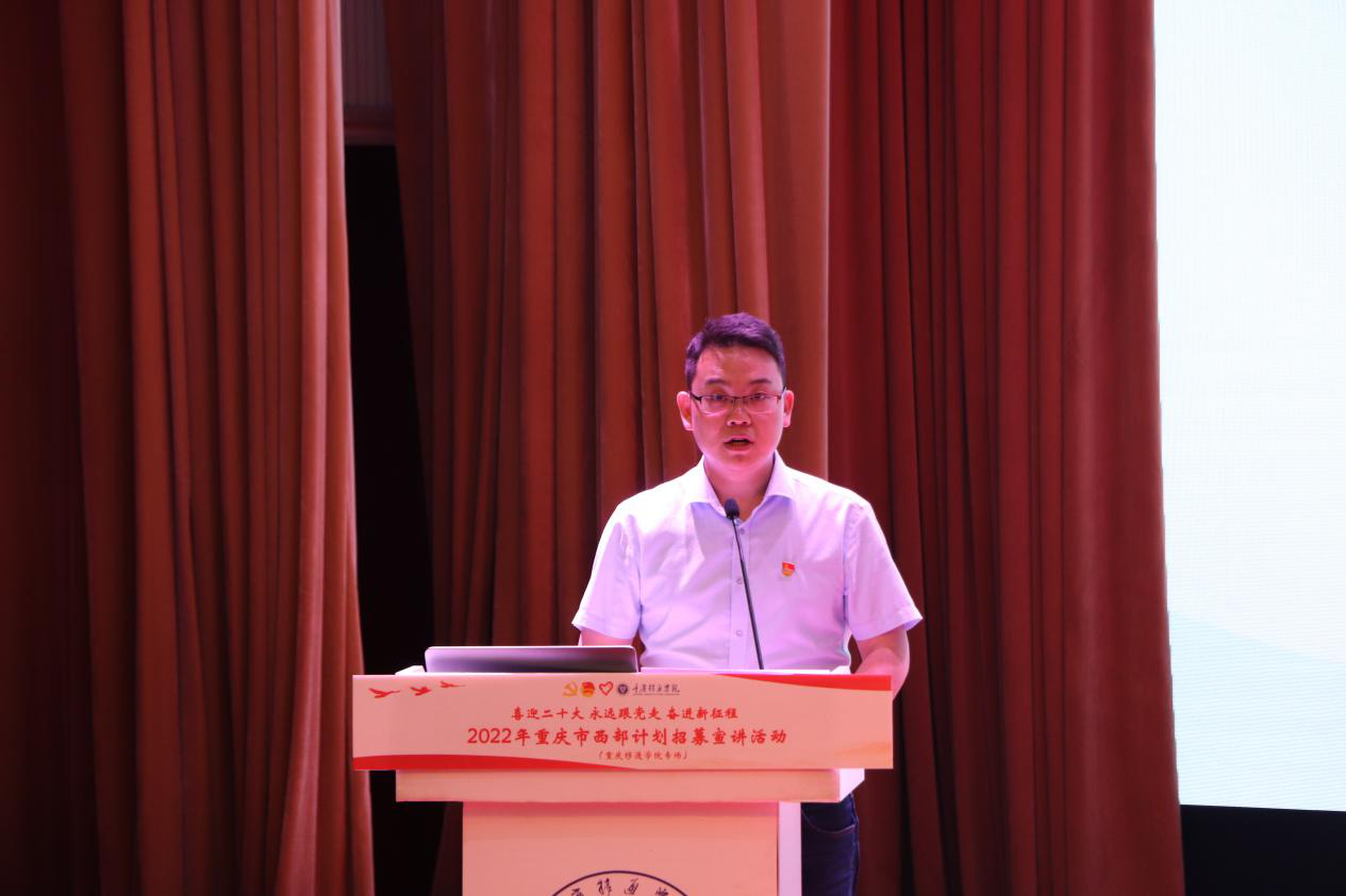 据悉,此次“2022年重庆市西部计划招募宣讲活动”在重庆仅开展三场,其中一场在我校开展。这场活动的落地,是对我校西部计划工作的有力肯定。自我校西部计划工作实施以来,一直积极响应团中央号召,在学校党委和上级团组织的领导下,大力弘扬志愿精神、培养学生家国情怀,引导学生把个人理想追求融入国家和民族的事业之中,不断推动全校大学生志愿服务西部计划工作蓬勃发展。近三年来,累计选派300余名应届毕业生奔赴祖国西部书写最美的志愿青春,实现自我价值。