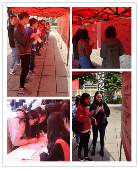 精彩的发言之后,活动的主场就交给了现场的观众们,工商所代表、老师代表和学生代表纷纷在主题喷绘上签下自己的名字表示对权益维护的支持,教学楼广场由挂满权益知识展板的帐篷组成的硕大“315”中布满了参加活动的同学,每个展板上都有关于消费维权方面的小知识问答以及青信体系的基本信息介绍,在这其中来来往往积极答题的人,低头思考、提笔急书;身穿红色小马甲的工作人员热心接待,答疑解惑。