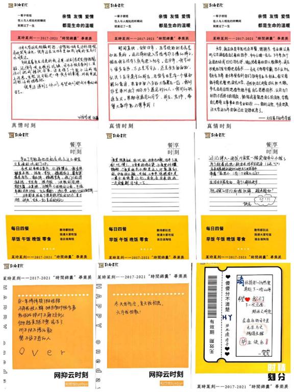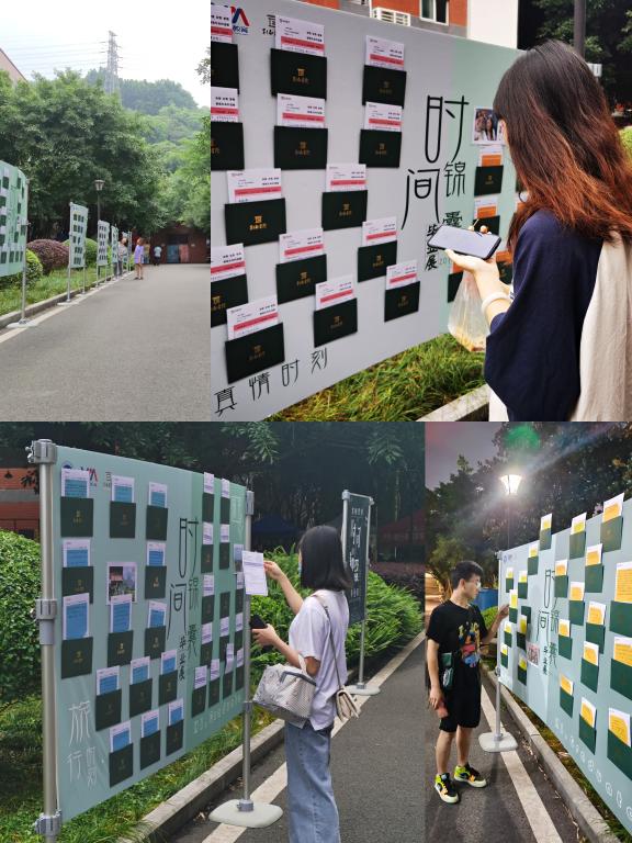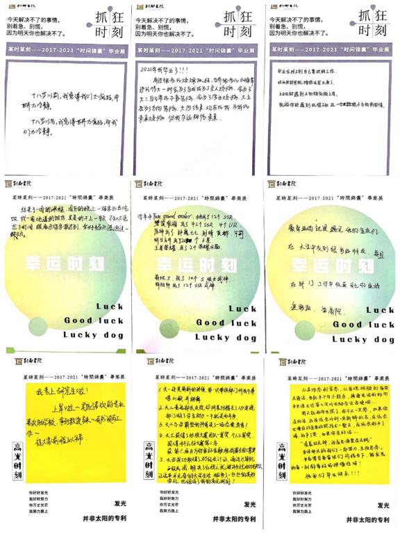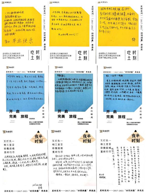 自5月中旬起,别都书院全体师生通过调研走访,面向书院毕业学子征集旅行时刻、餐享时刻、真情时刻、高光时刻、吃瓜时刻、吃土时刻、夜半时刻、精分时刻、抓狂时刻、网抑云时刻10类青春记忆内容,并将其以专属卡片的方式展示与时间锦囊长廊上。卡片中有幸运专属珍藏:“在广袤的空间和无限的时间里,能够与你们一起度过一段时间,这本身就是一种幸运。”有完美旅程:“大学四年,最北去了北京、最南去了三亚;去过了拉萨,也看过了青海,总有些惊喜的奇遇。没有顾虑、抛开其他,遇见各种各样的人,更好地做自己。”也有真实内心独白:“2021年我毕业了!曾经有过很多烦躁抓狂,现在的我,虽然也为我的未来烦恼,但我永远相信未来。”纷纷引来书院学子驻足观看,用大学生活的真实写照引起同龄人共鸣,定格青春记忆。