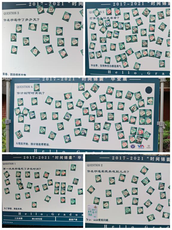 活动现场,设置5类时间互动展板,邀请毕业学子现场参与回答。“家人自驾7小时奔赴移通、连续一周通宵做毕业设计、在移通的日子都是快乐时光、毕业了但不想说再见、和家人一起再回来看看……”这些回答展示着他们来移通报道的喜悦、诉说着通宵达旦追逐梦想的努力、满载着大学生活分秒必争的充实、显露出阔别母校依依不舍的挽留。这一次,用毕业留言来纪念移通生活、学习的四年光阴,用时间数字来细数我们的下一次相遇。