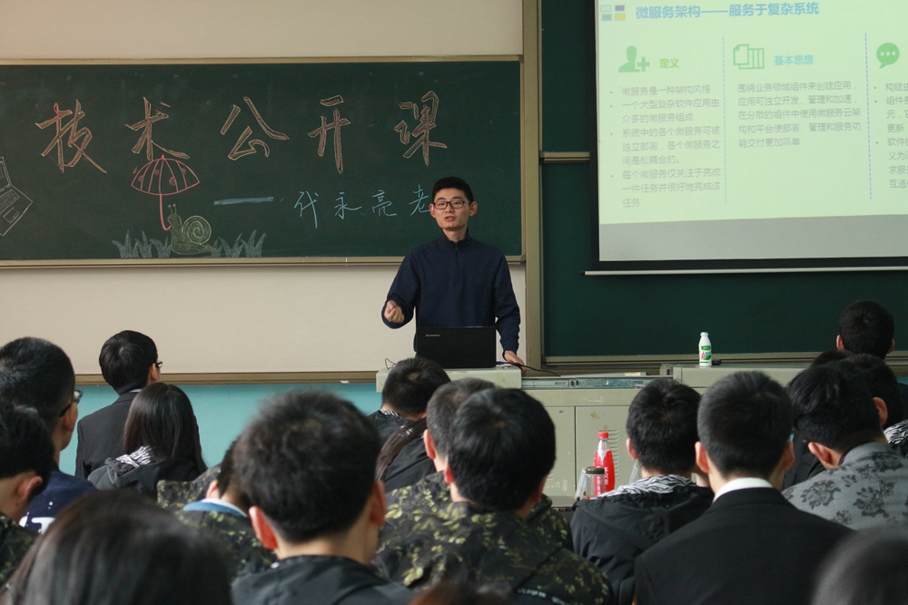 2017年4月28日下午13:00,双体系本学期第二次技术公开课在项目一部进行。双体系技术教师代永亮将“微服务架构”带到了现场,希望通过本次技术公开课,将微服务的概念分享给双体系各位学员,让大家了解单体式应用开发的不足和缺陷,且熟悉微服务架构在企业中的应用与优势。